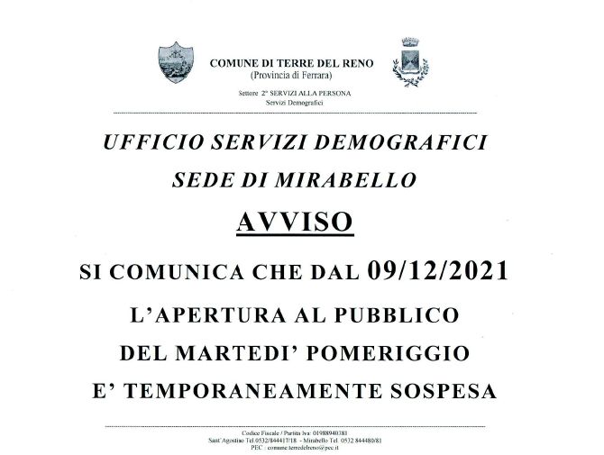 Si informa la Cittadinanza che a partire dal 09/12/2021 l'apertura al pubblico del martedì pomeriggio dell'Ufficio Servizi Demografici sede di Mirabello è temporaneamente sospesa.