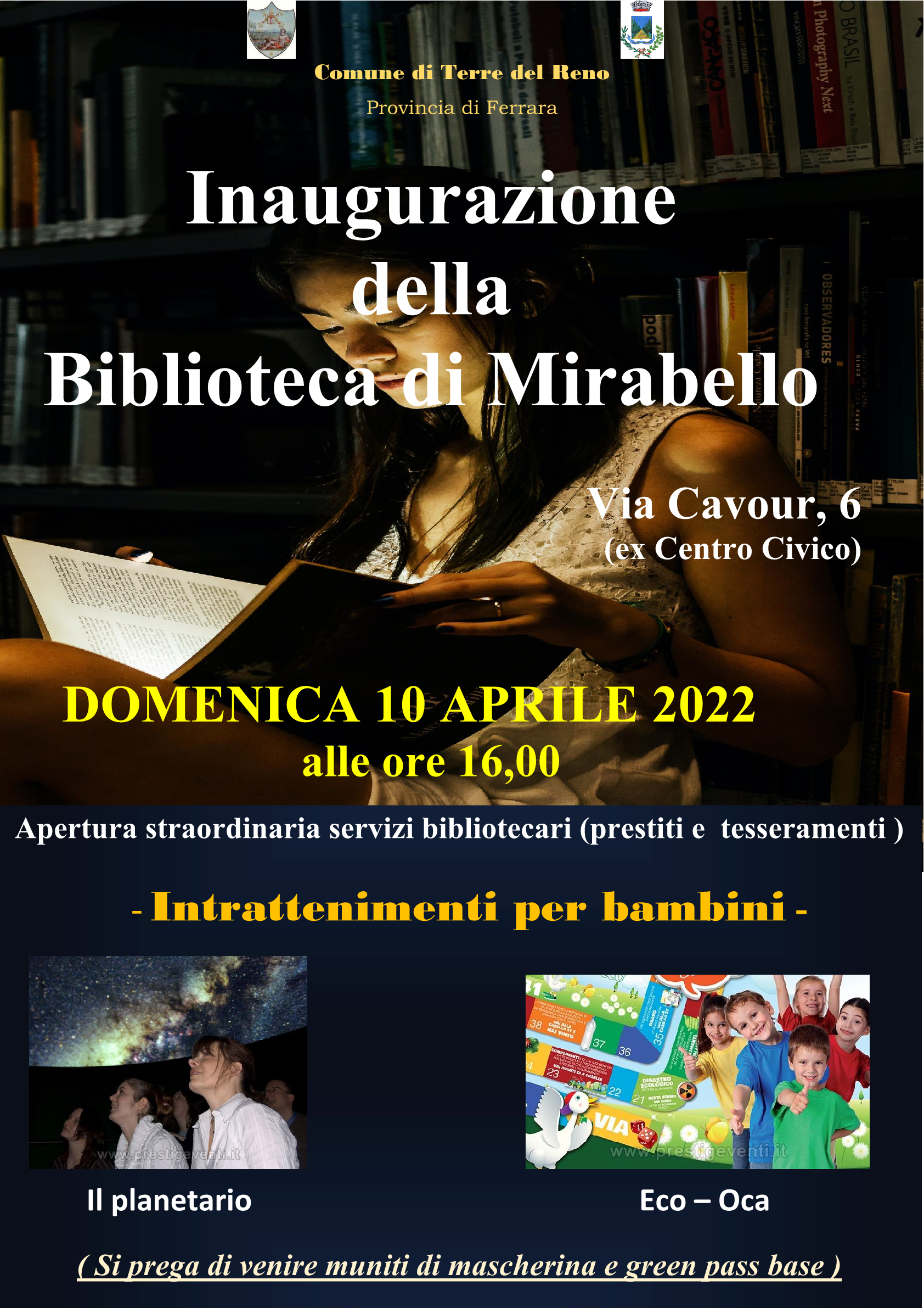 verrà inaugurata la Nuova Biblioteca di Mirabello sita in Via Cavour nr. 6 ( presso l' ex Centro Civico ).