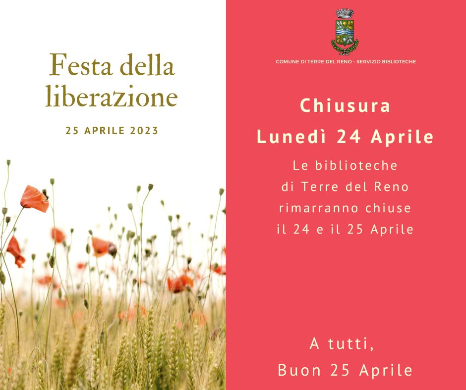 CHIUSURA BIBLIOTECHE COMUNALI giovedì 20 aprile 2023 Si comunica alla Cittadinanza che il 24 e 25 Aprile le Biblioteche comunali di Mirabello e Sant'Agostino rimarranno chiuse.