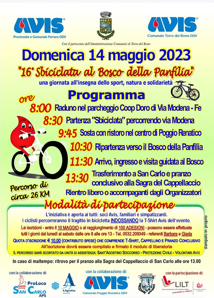 Domenica 14 Maggio 2023 si svolgerà la 16ma Sbiciclata al Bosco della Panfilia, a cura di AVIS Provinciale e Comunale Ferrara ODV e AVIS Comunale Terre del Reno ODV, con il patrocinio dell'Amministrazione Comunale di Terre del Reno.