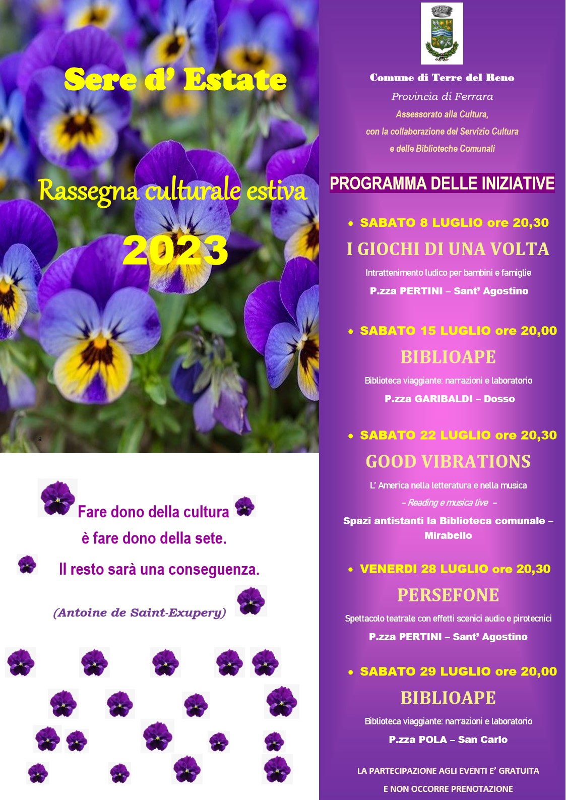 Gli Assessorati alla Cultura ed alla Pubblica Istruzione, in collaborazione con il Servizio Cultura e le Biblioteche culturali, presentano il programma delle iniziative culturali organizzate dall' Amministrazione Comunale per l' Estate 2023.