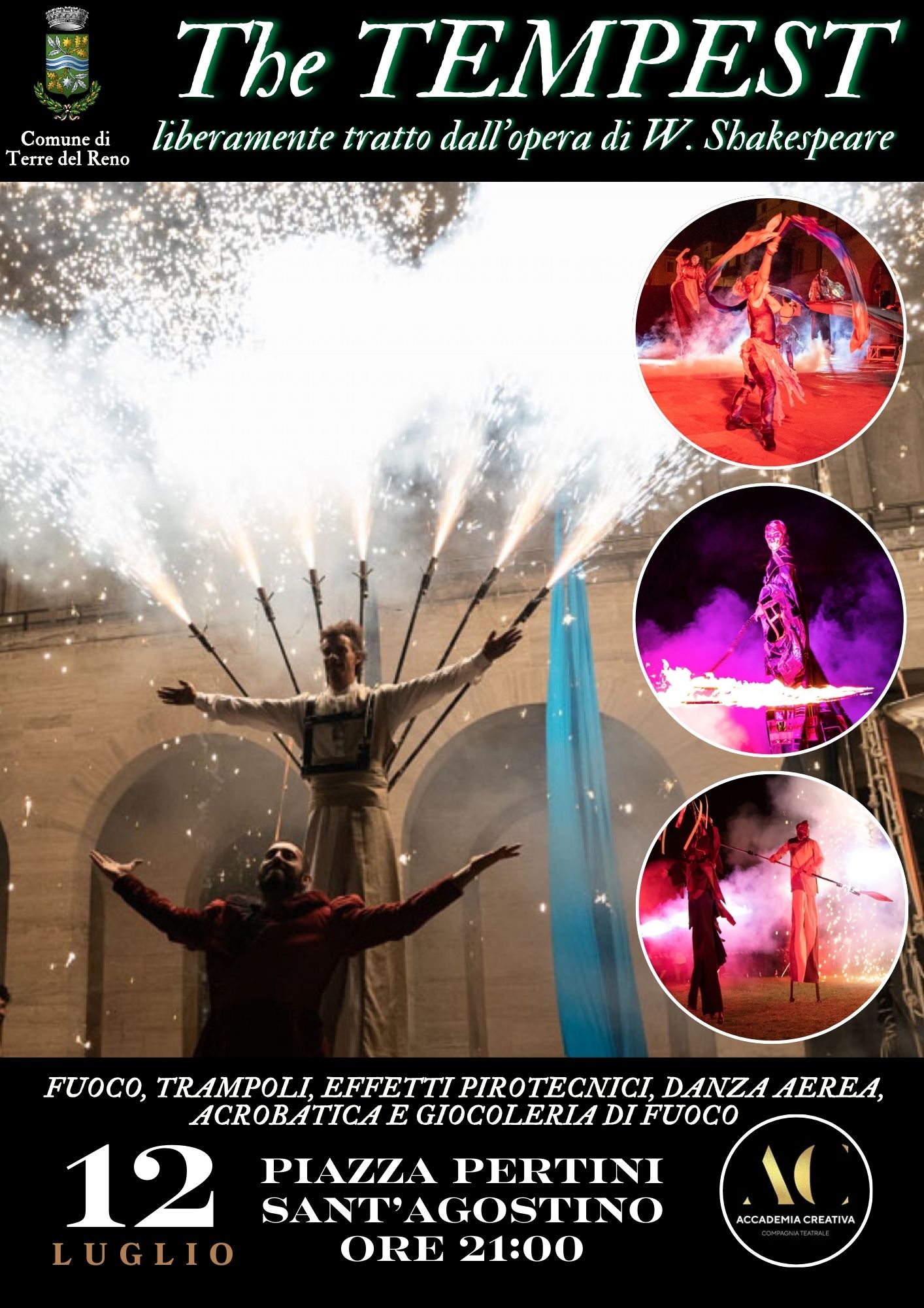 Il 12 luglio alle ore 21.00 presso piazza Pertini a S. Agostino si terrà lo spettacolo gratuito dal titolo “The Tempest” tratto da un’ opera di William Shakespeare, messo in scena attraverso tecniche di cirque nouveau, teatro di strada, maschere, teatro di immagine, qualcosa di mai visto a Terre del Reno.