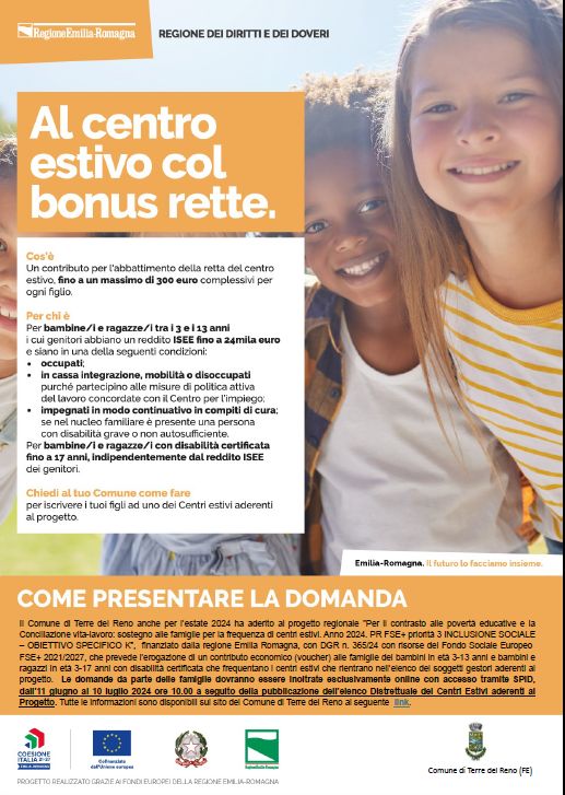Si rende noto che con Determinazione n. 1013 del 21/10/2024 il Comune di Cento, in qualità di Comune capofila del Distretto Ovest-FE ha provveduto ad approvare la graduatoria distrettuale per l'assegnazione dei contributi relativi al "Progetto Conciliazione Vita-Lavoro" Anno 2024 (Voucher Centri Ricreativi Estivi Anno 2024).