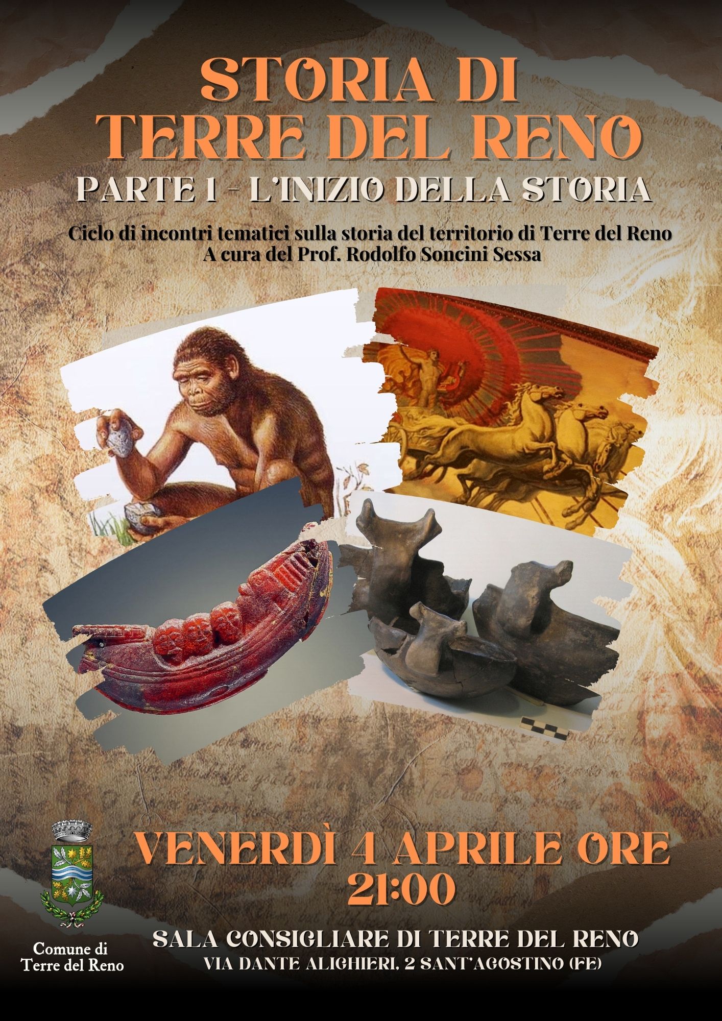 Il Comune di Terre del Reno inaugura un ciclo di incontri tematici sulla storia del territorio, curato dal Prof. Rodolfo Soncini Sessa, esperto di storia e curatore del Museo della Civiltà Contadina di Terre del Reno. Il primo appuntamento, intitolato "L’inizio della Storia", si terrà venerdì 4 aprile alle ore 21:00 presso la Sala Consiliare di Terre del Reno (Via Dante Alighieri, 2 – Sant’Agostino, FE).