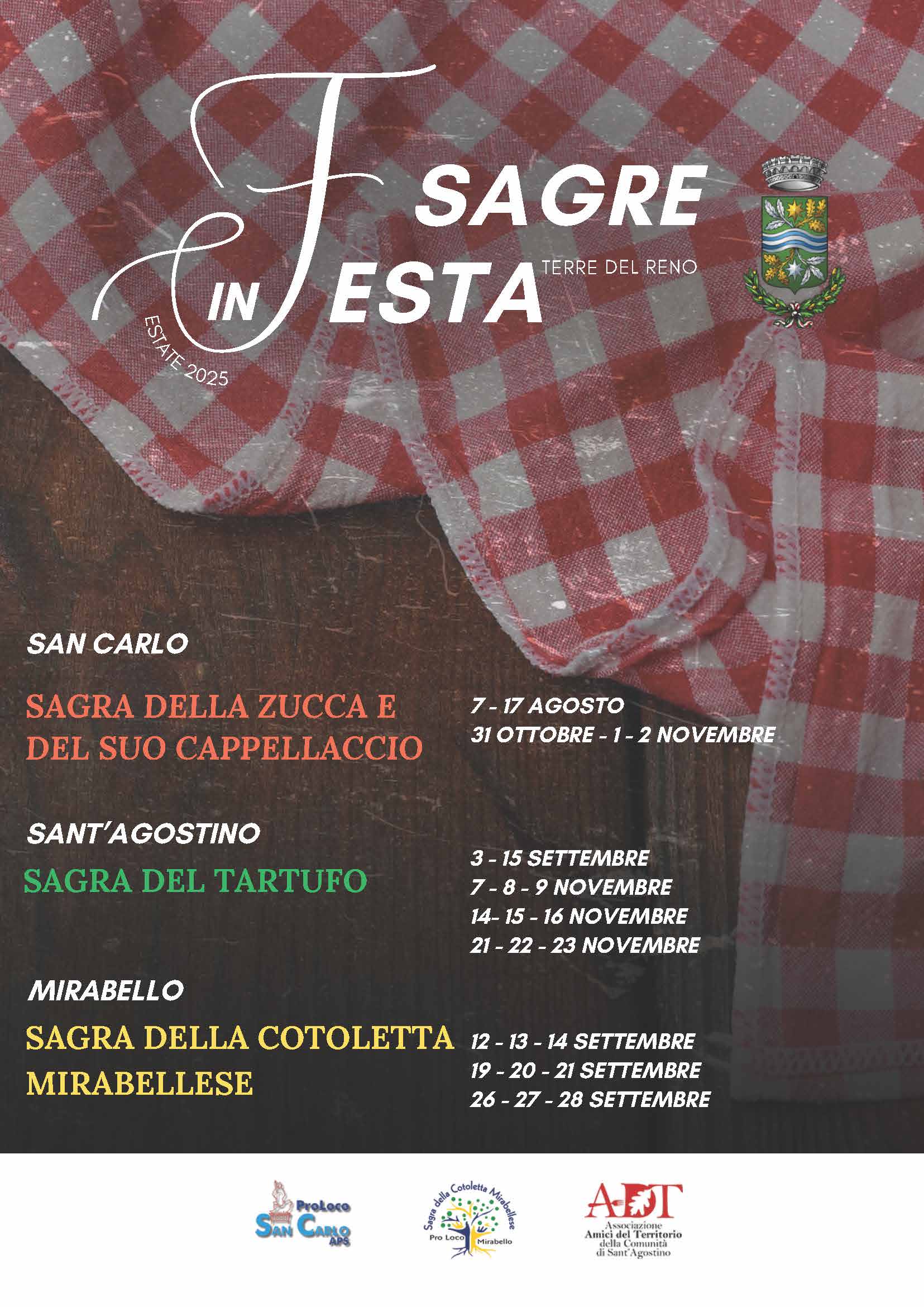 Torna anche quest’anno nel Comune di Terre del Reno l’attesa rassegna “Sagre in Festa”, un percorso gastronomico che attraversa i mesi tra agosto e novembre e coinvolge le tre frazioni di San Carlo, Sant’Agostino e Mirabello. Al centro ci sono tre appuntamenti diventati simbolo della cultura locale: la Sagra della Zucca e del Cappellaccio di San Carlo, la Sagra del Tartufo di Sant’Agostino e la Sagra della Cotoletta Mirabellese. Un’occasione unica per vivere il territorio attraverso i suoi sapori e la passione delle tante persone che, ogni anno, rendono possibile questi eventi.