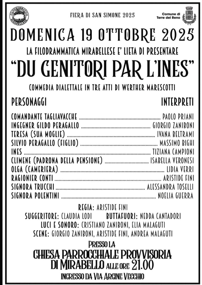 Domenica 19 ottobre 2025, in occasione della Fiera di San Simone, la Filodrammatica Mirabellese torna sul palcoscenico con una nuova commedia dialettale in tre atti di Werther Marescotti dal titolo “Du genitori par l’Ines”.